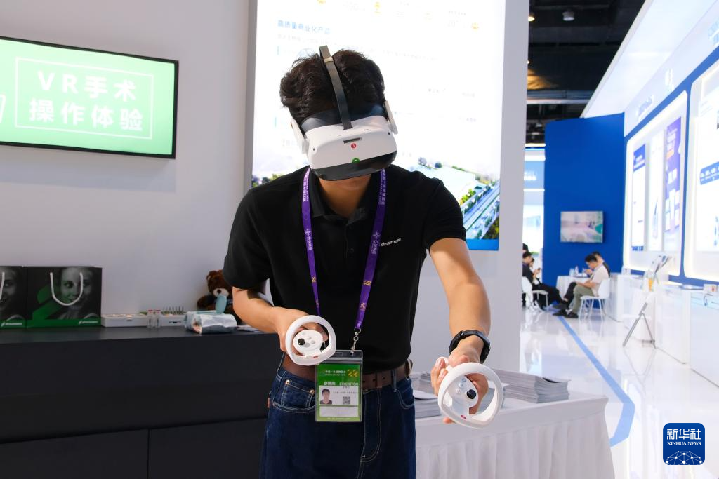 9月19日,在南宁国际会展中心,工作人员用VR眼镜体验手术操作过程。
