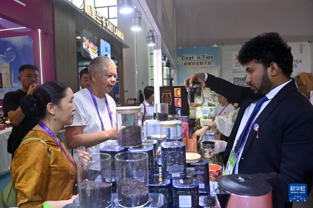9月20日,在广西南宁国际会展中心斯里兰卡展馆,客商在洽谈合作事宜。
