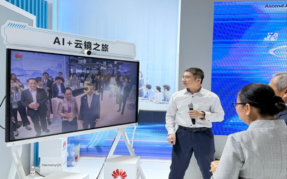 展区内的“AI+云镜之旅”互动体验吸引了众多参观者。该体验基于华为云服务,用户仅需拍摄一张照片,系统即可实时生成8张国内或东盟各国地标、网红打卡点的精美照片及视频。