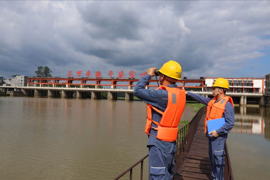 容县供电公司容城电站员工检查水位情况。伍波丽 摄