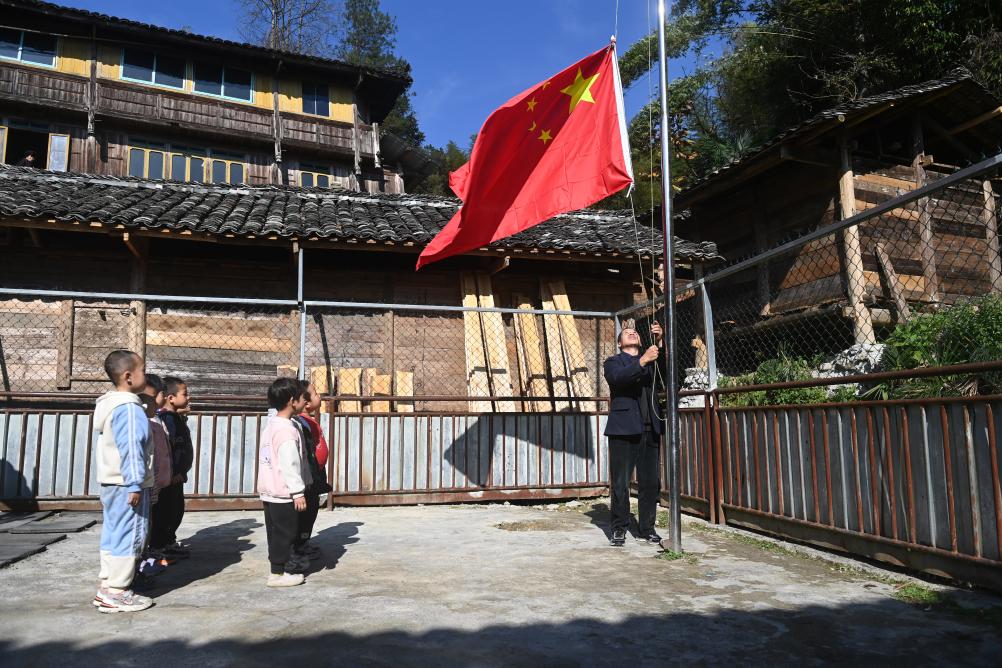 广西龙胜各族自治县龙脊镇满田小学的潘从汉老师和学生升国旗(2023年11月29日摄)。
