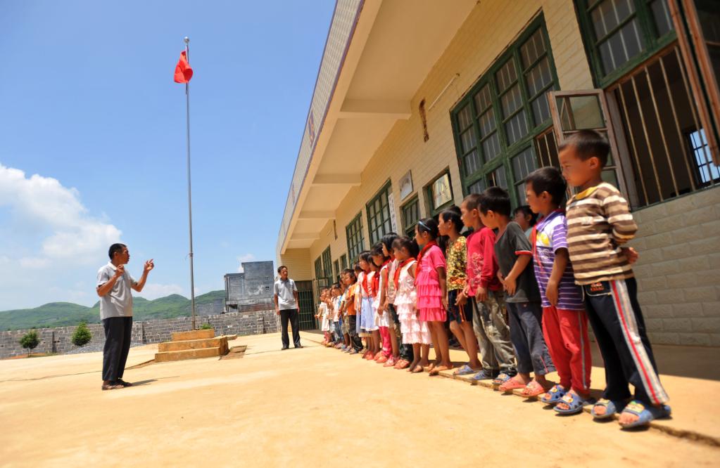大山教学点,很多学校只有小学一到三年级学生,有的只有一、二年级几个小孩。由于学生幼小,无法独自担当升旗手,很多老师不管年龄多大,都要自己担当这个神圣的角色,扛起国旗站到旗杆下跟着国歌的节拍,拉着手中的绳子抬头仰望国旗升起。
