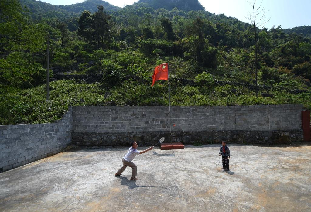 在广西都安瑶族自治县菁盛乡义德小学弄豆教学点,蓝启飞老师(左)和学生蓝孟源课后打羽毛球(2015年4月15日摄)。