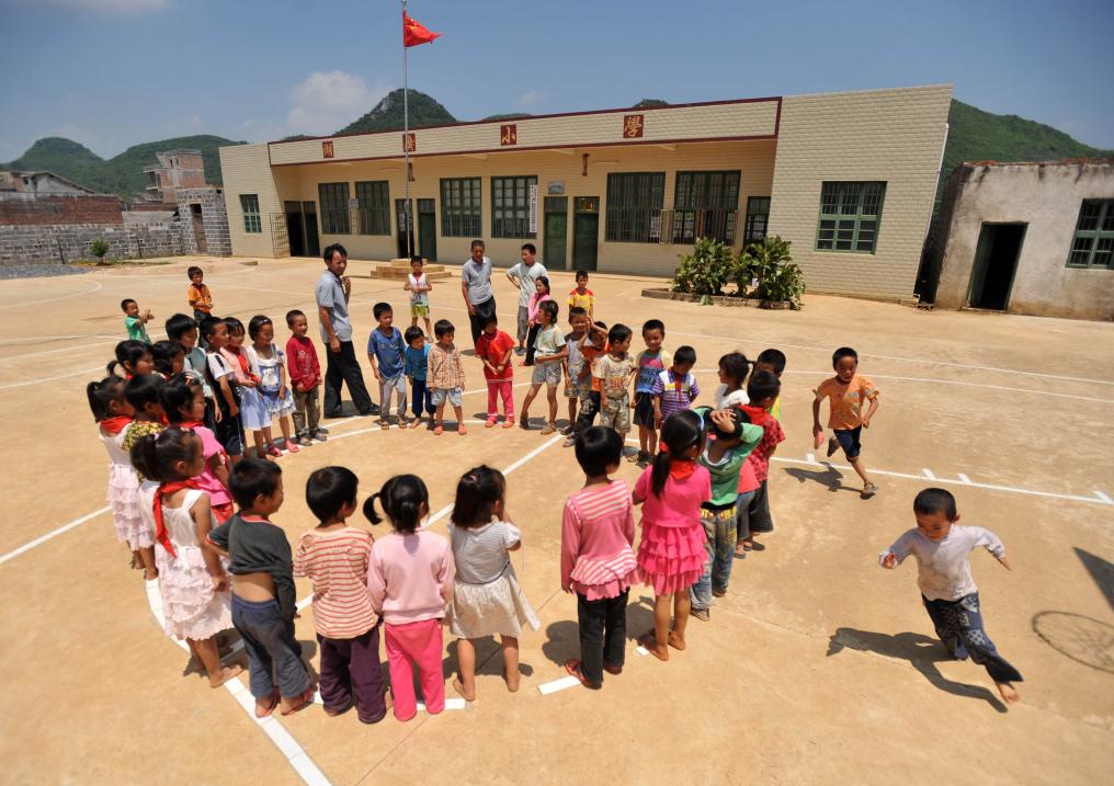 湖广小学师生一起做游戏(2013年6月19日摄)。