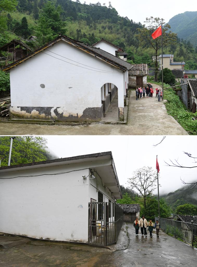 拼版照片。上图:在广西全州县蕉江瑶族乡苦马田教学点,卢加红老师和学生升国旗(2016年4月28日摄);下图:黄利老师和学生从学校外走过(2025年4月24日摄)。
