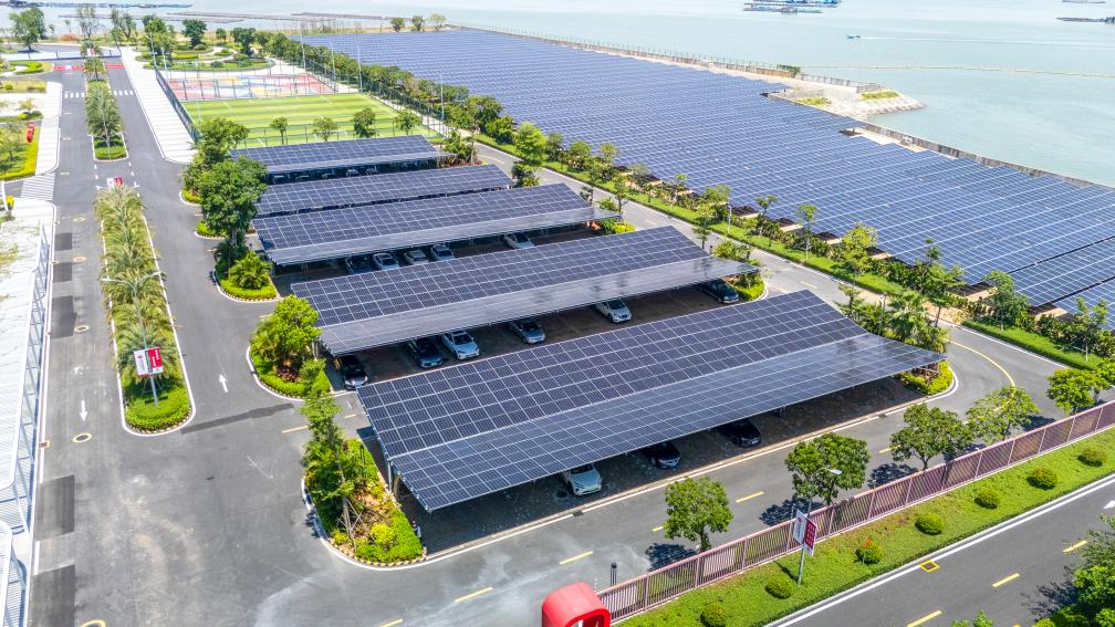 为探索从常规能源向绿色低碳能源转型路径,国能北海公司充分利用厂区空地、屋顶资源,建设27.29MWp分布式光伏项目,于2024年12月正式投产。该项目无需占用额外土地,通过融合“光伏车棚+智能充电桩”的复合模式,一排排光伏板既为厂区供电,也为员工的电动车、汽车提供清洁电能。据测算,该项目年均发电量可达3302.22万千瓦时,与相同发电量的火电相比,每年可节约标煤1.032万吨,相应每年减少排放温室效应气体、CO2约3.318万吨,减少排放大气污染气体S02约998.3吨、NOx约499.14吨,减少化石资源的消耗,有利于缓解环境保护压力,实现经济与环境的协调发展。