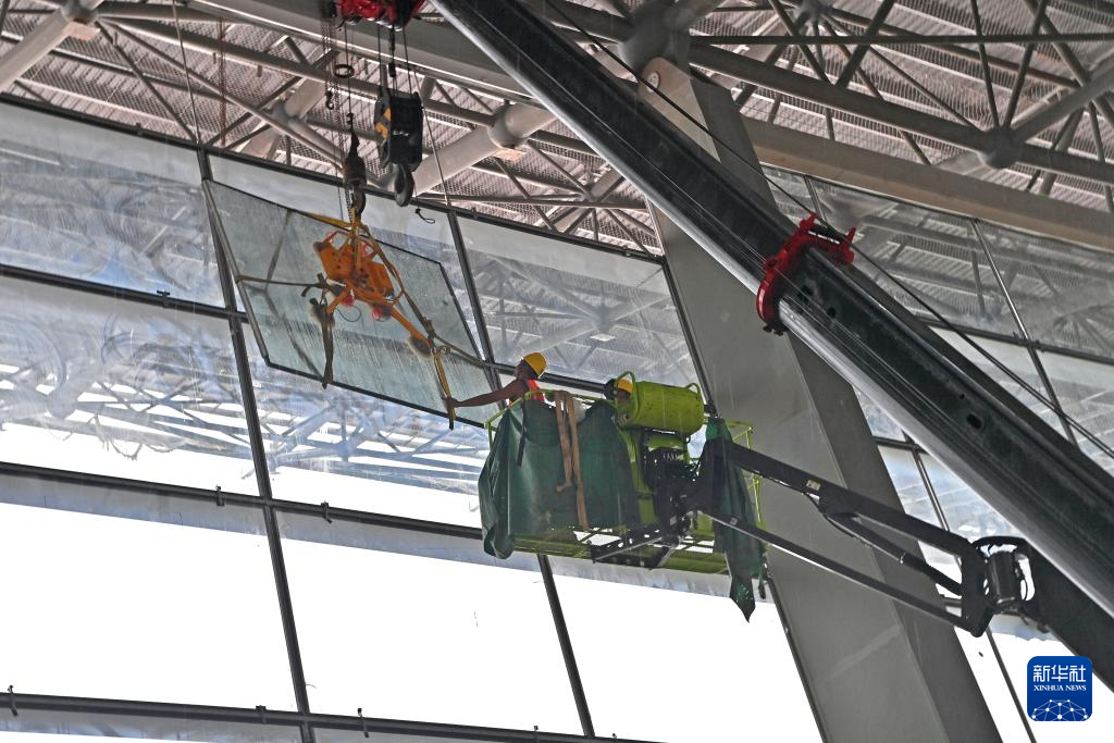10月15日,中建二局的建设者在南宁吴圩国际机场T3航站楼二标段安装玻璃。