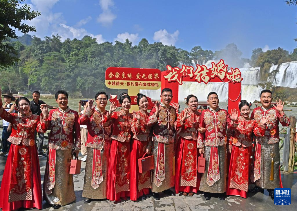 新华社南宁10月19日电(记者田子骏、邹雨沁)18日,在广西崇左市大新县的中越德天(板约)瀑布跨境旅游合作区,秋日的阳光洒在奔腾的瀑布上,水雾弥漫中,一场别开生面的集体婚礼正在举行。