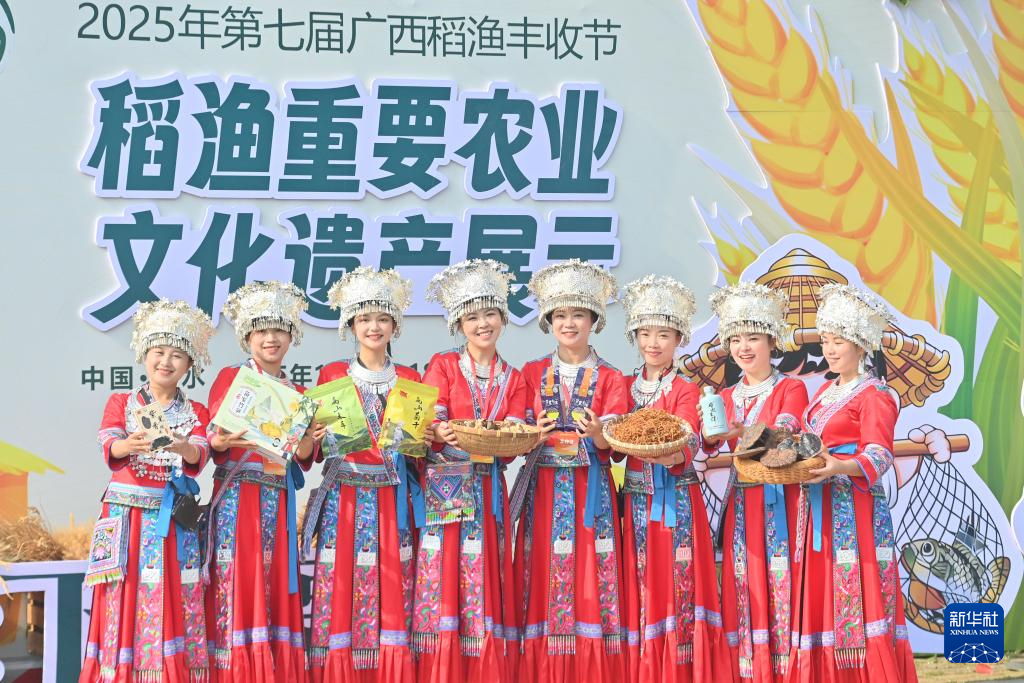 10月18日,在柳州市融水苗族自治县梦呜苗寨,工作人员在第七届广西稻渔丰收节上展示农特产品。