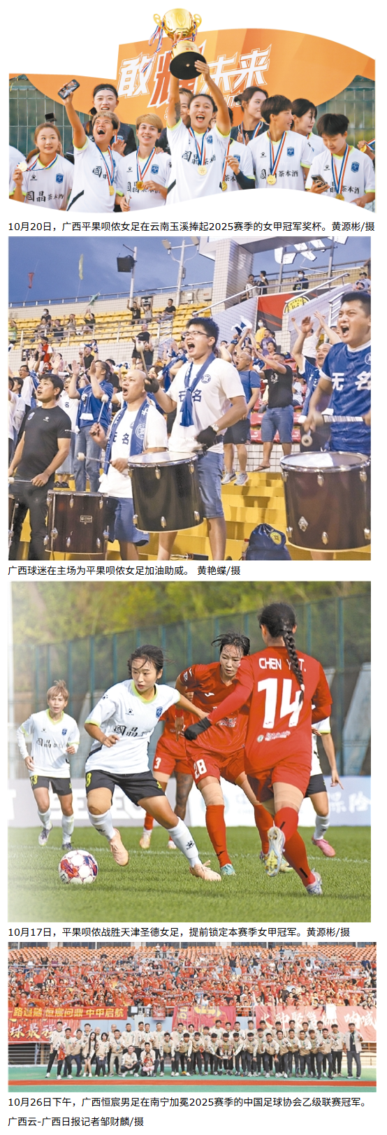 这个秋天,广西足球收获了许多希望。平果呗侬女足“升超”,广西恒宸男足也夺得乙级联赛冠军,顺利冲甲。这是广西足球在2025赛季实现的一个历史性突破:加冕全国女子、男子职业联赛“双冠”,双双向更高的职业联赛平台进发。