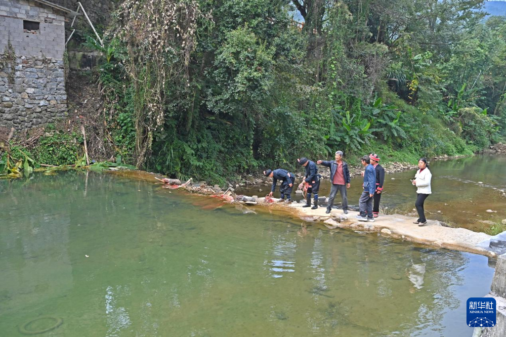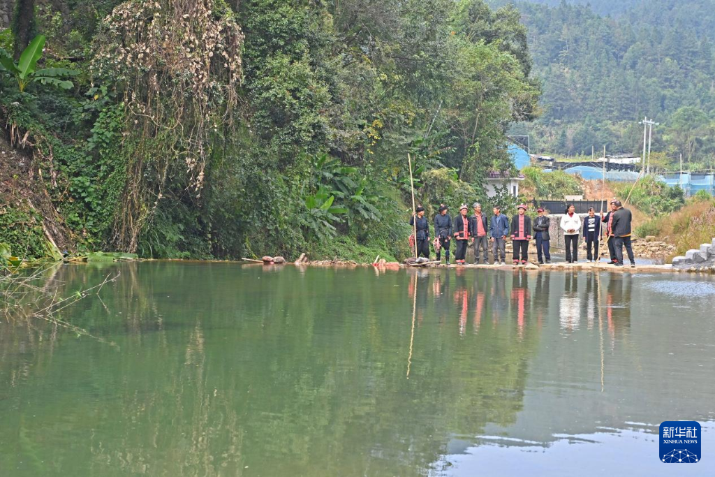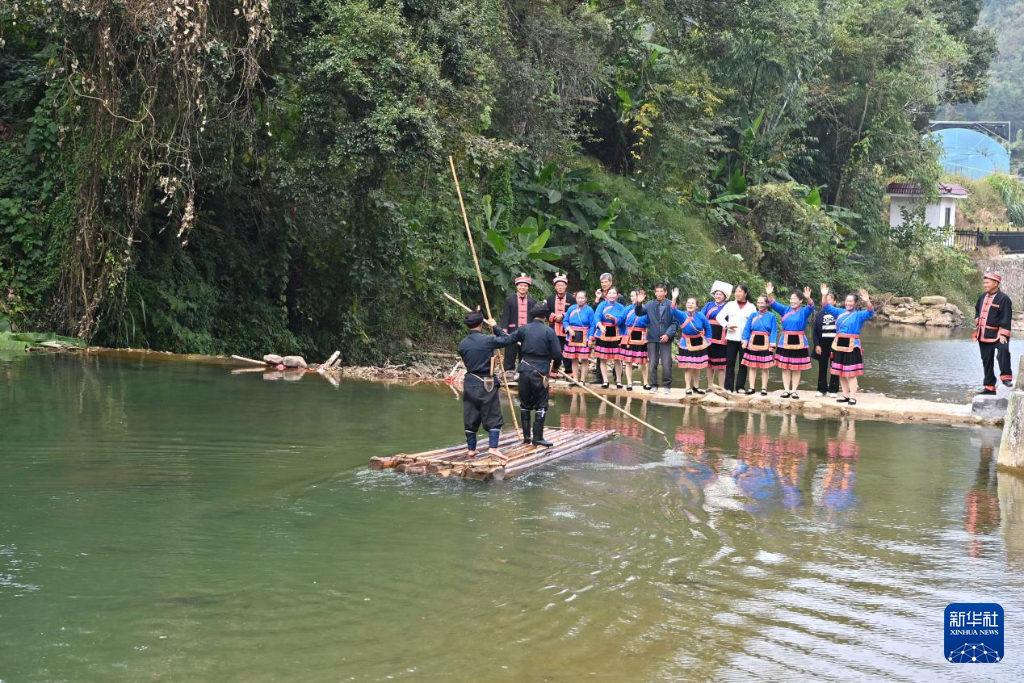 10月29日,两地群众在广西金秀瑶族自治县三角乡六定村六定河边回忆当年放木排的情景。新华社记者 周华 摄