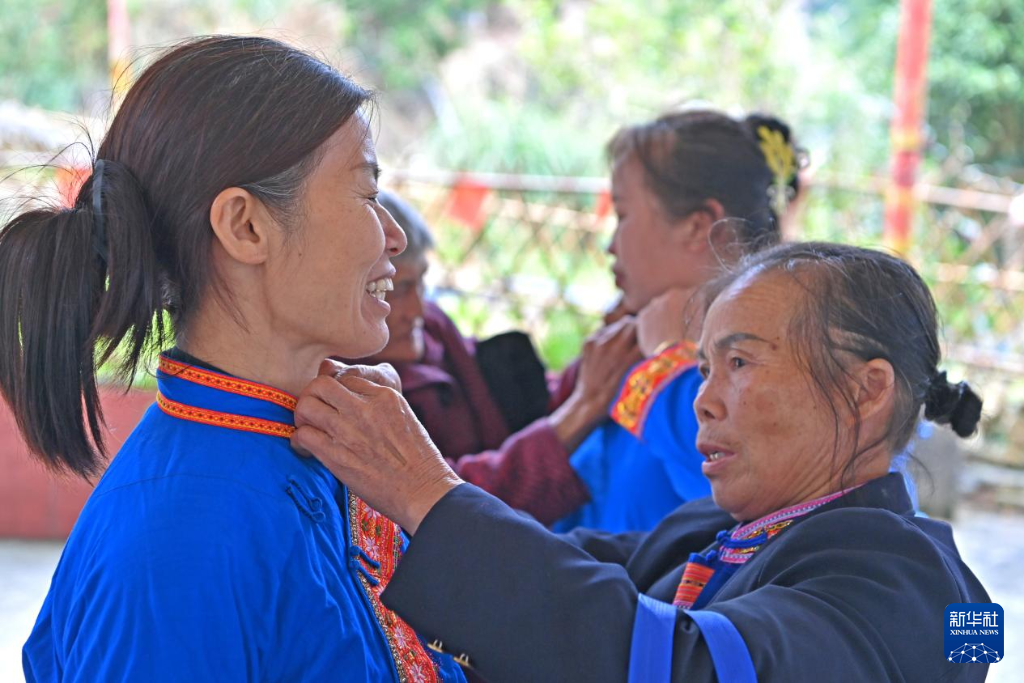 10月29日,德高望重的老人在广西金秀瑶族自治县三角乡六定村,为来自修仁镇的“老同”穿上瑶族服装,让其感受家人般的热情。这一习俗在当地瑶族地区被称为“妆瑶”,即把远来的好友妆扮成瑶族,让其感受回到家的热情。新华社记者 周华 摄