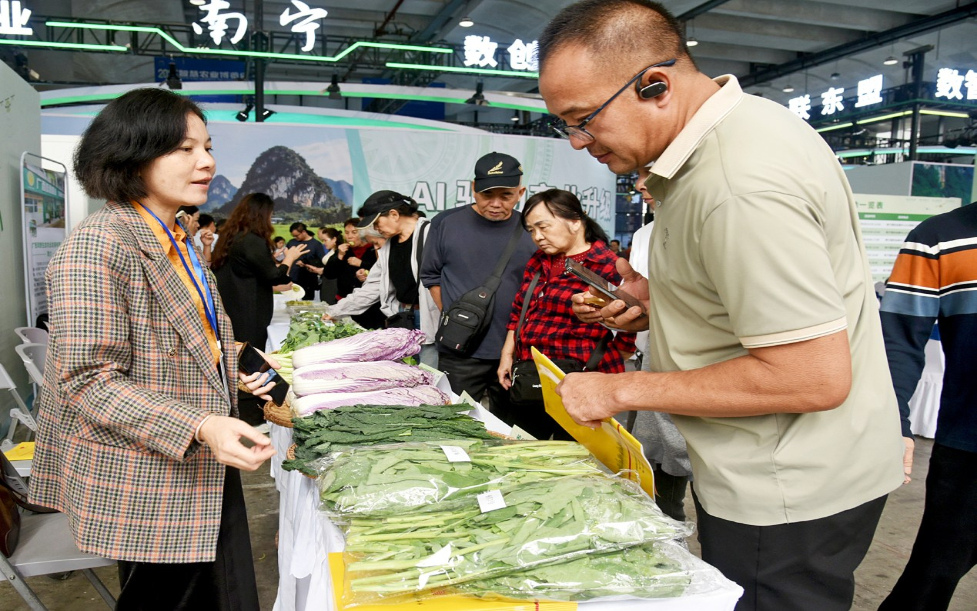 在南宁一家农业企业展台前,一名广东客商(右一)详细询问蔬菜品种,并表示想去种植基地进一步了解情况。记者刘增璇 摄