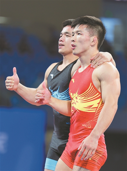 男子自由式摔跤57公斤级比赛,广西队是绝对的王者。4年前的第十四届全运会,刘明瑚与邹万豪分获冠亚军。4年后的粤港澳全运会,上半区的刘明瑚每场比赛都以绝对技术优势(比分差距10分)获胜,下半区的邹万豪也一马平川轻松通关。两人早早为广西队圈定金牌。