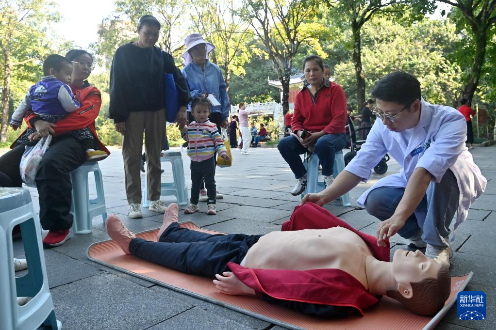 11月14日,在广西南宁市金花茶公园,医务工作者为市民讲授急救知识。