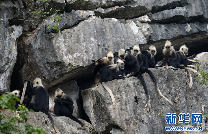 猴群在岩壁上休憩。新华社记者费茂华 摄