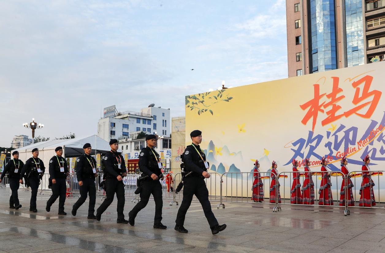 11月16日,民警在桂林马拉松赛事起点开展巡逻,排查各类安全隐患。蒋田 摄