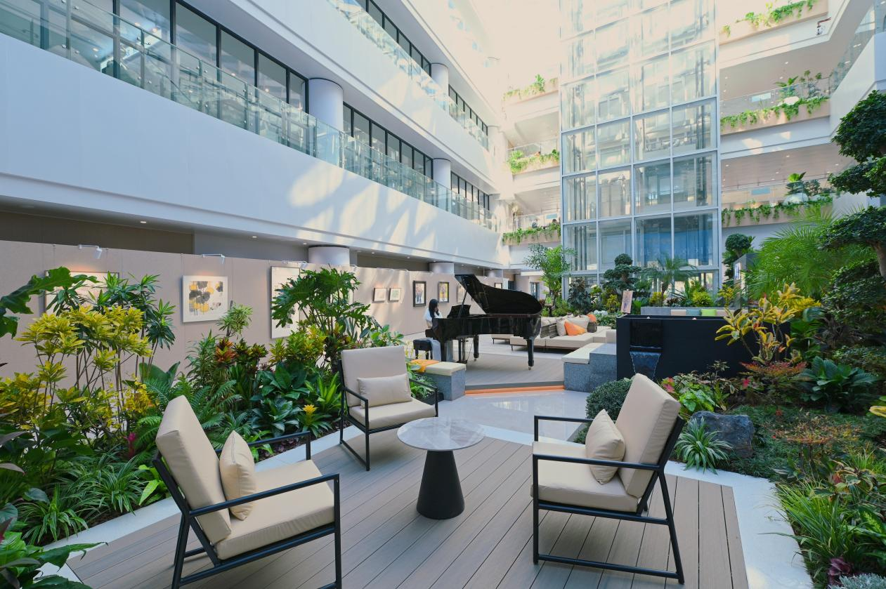 在环境建设方面,广西自贸区医院以“人文医院、花园医院”为设计导向,携手广西美术馆融入艺术之美,创新打造开放式门诊大厅,巧妙融合多元业态,通过约70000平方米的多层次景观体系,打造“花园式”疗愈空间。