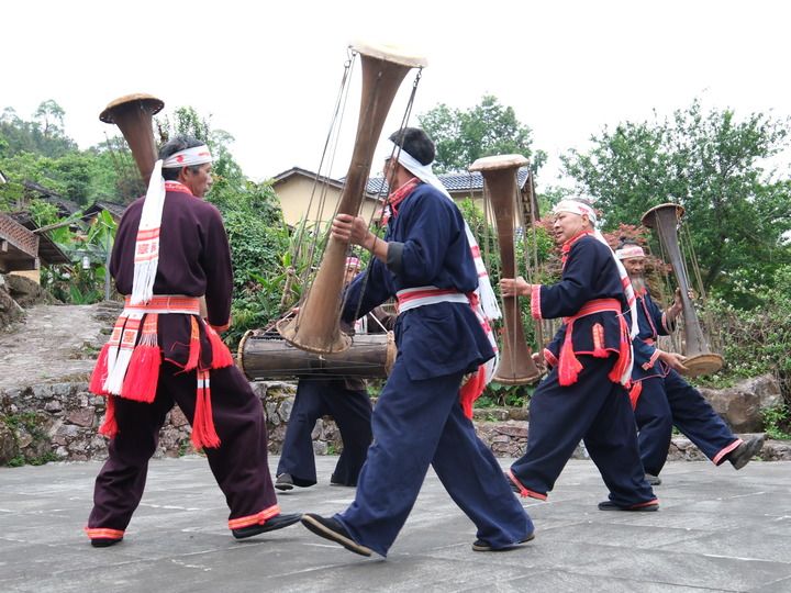 跳黄泥鼓的舞者,头上绑着白色的抹额,身着藏青色布衫,腰系红绳。表演者通常是五位男性村民,其中四人挎着公鼓,不断变换走位,将一面母鼓围在中央,敲打鼓面发出“空央、空央”的声音,在古时候用以祈求神灵保佑。