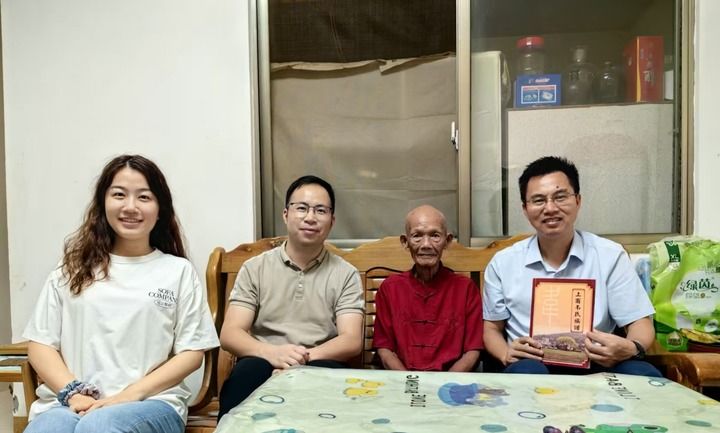 图为2025年本报调研组与90年前费孝通、王同惠进入大瑶山的向导韦守超的孙子——九旬老人韦中文的合影。
