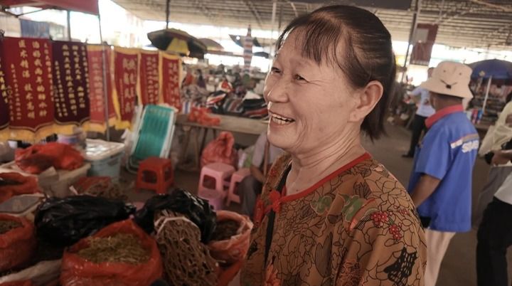 广西象州县百丈乡圩市上售卖瑶医药的盘瑶妇女谭月荣。新华每日电讯记者邹雨沁摄