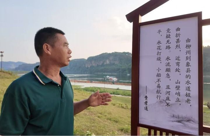码头边的石条长坡下,立着两块牌子。一块是“徐霞客上岸点”,一块则刻着《桂行通讯》的记述:“由柳州到象县的水道极老,曲折甚烈,近弯处,山壁峭立,竟疑无路,水流颇急,且河床不平,水花打旋,小船不易航行。”