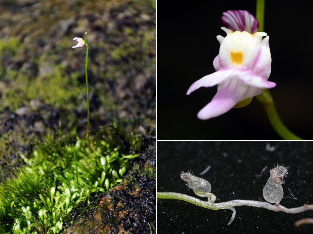 左边为大明山挖耳草生存环境,右上角是大明山挖耳草的花,右下角是捕虫囊。(吴双摄)