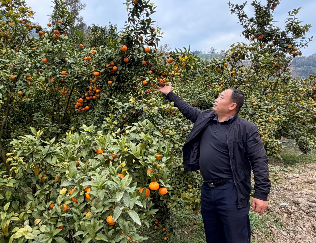 12月9日,周昌战在百坭村果园里查看砂糖橘生长情况。新华社记者雷嘉兴 摄