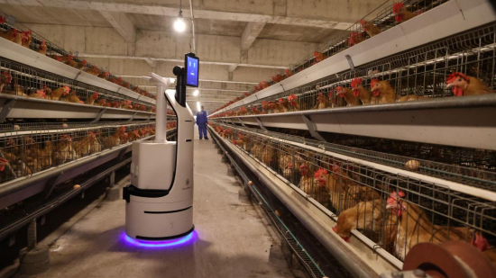 在广西玉林市福绵区的参皇养殖集团凤鸣八桂示范区,10层高的“智能鸡宿舍”里,AI巡检机器人正穿梭巡行。高清镜头捕捉鸡群神态,环境传感器实时回传数据,勾勒出动态的“鸡群健康热力图”。