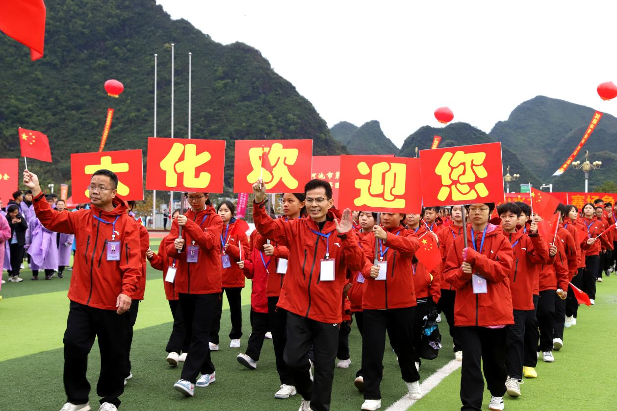 12月24日,以“全民健身 • 健康你我”为主题的河池市第八届运动会在大化瑶族自治县公共体育场开幕,来自全市11个县(区)以及市直机关共12个代表团的2000余名运动员将展开为期6天的角逐。本届运动会共设有篮球、足球、气排球、乒乓球、羽毛球、投绣球、田径等7类比赛项目。(黄晗 摄影报道)