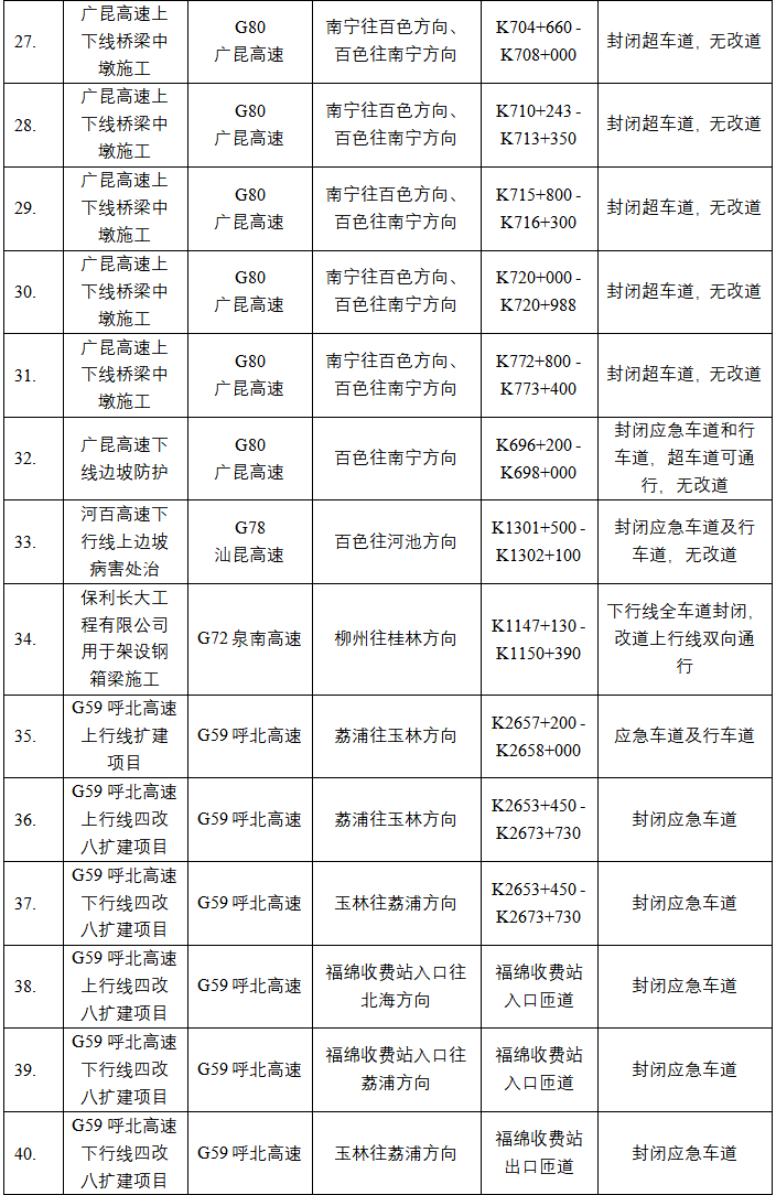 有S75武忻高速K26+952-K28+917(双向),柳覃路(在建)跨武忻高速涉路施工;G72泉南高速K1287+994-K1289+895鱼宜高速跨泉南高速修建龙南枢纽45处涉路施工区不能撤离,易因通行能力下降导致拥堵缓行。元旦节期间,原则上不允许施工,紧急抢修危及行车安全的设施或严重路面病害的除外,抢修路段请看链接:广西高速公路出行信息服务网。