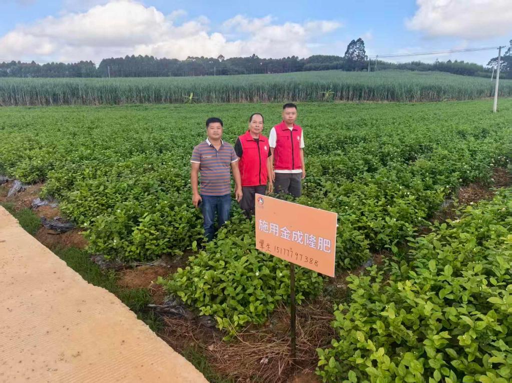 科技特派员覃培松(中)、韦振飞(右)在田间开展茉莉花液肥提质增效试验。