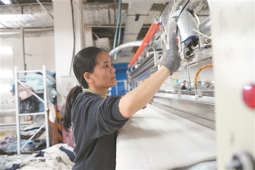 南宁市广丰贸易有限公司生产车间,员工韦凤枚正在操作熨烫机。