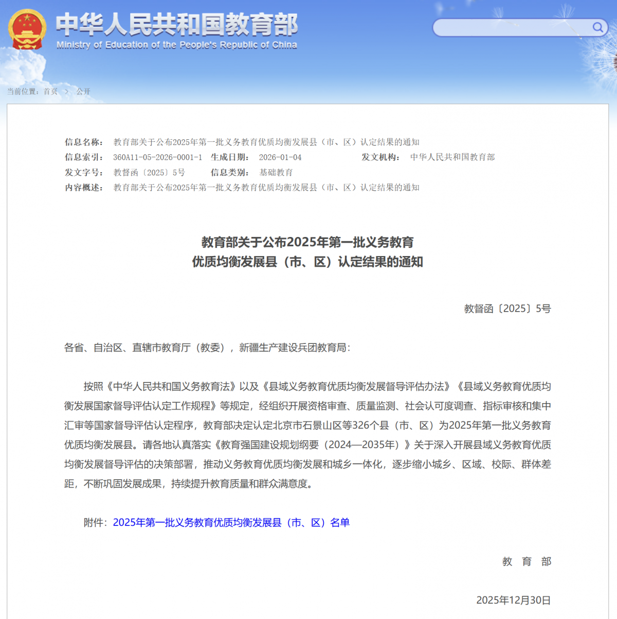 经组织开展资格审查、质量监测、社会认可度调查、指标审核和集中汇审等国家督导评估认定程序,近日,教育部印发通知,决定认定326个县(市、区)为2025年第一批义务教育优质均衡发展县。