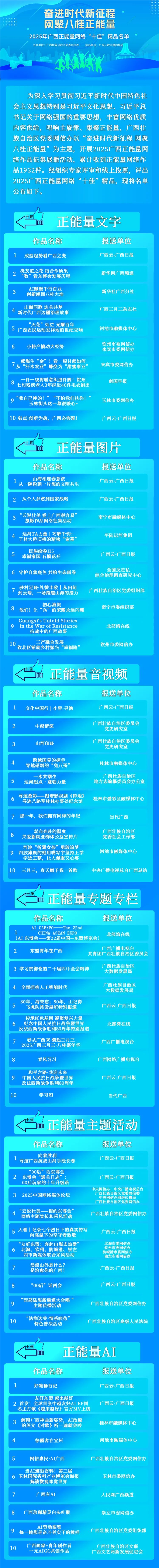 本次活动以“奋进时代新征程 网聚八桂正能量”为主题,自2025年7月28日启动以来,得到全区各单位、各设区市、媒体机构的积极参与。经组织专家评审和线上投票,最终评选出《成型起势看广西之变》等10件作品获正能量文字类“十佳”精品,《山海相连春意浓|从一碗粉到一片海的文明共生》等10件作品获正能量图片类“十佳”精品,《文化中国行|小雪·寻渔》等10件作品获正能量音视频类“十佳”精品,《 AI CAEXPO——The 22 CHINA-ASEAN EXPO(AI 东博会——第22届中国—东盟博览会)》等10件作品获正能量专题专栏类“十佳”精品,《向着胜利·寻迹广西抗战山河手绘长卷》等10件作品获正能量主题活动类“十佳”精品,《好物畅行记》等10件作品获正能量AI类“十佳”精品。其中,广西日报社共有16件作品入围。