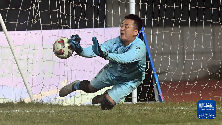 1月17日,在广西钦州市体育馆,灵山队守门员赖春荣在比赛中扑出点球。
