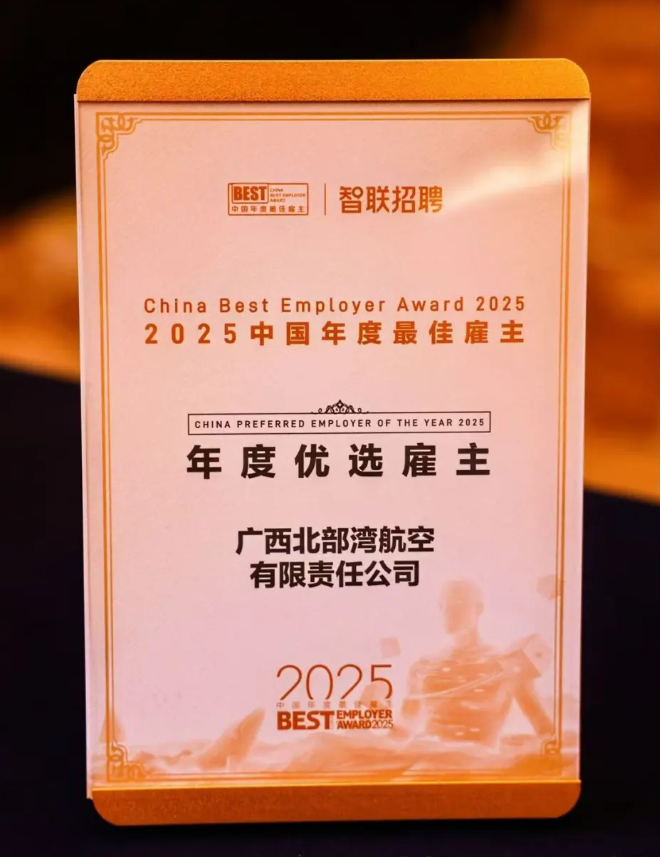 “中国年度优选雇主”评选由智联招聘发起,以企业人才管理质量与求职者体验为核心,建立雇主“招聘信用”标准,从多个维度进行综合评估,遴选优质企业。北部湾航空成功入选,充分体现了公司在合规经营、员工权益保障及良好职场生态建设方面的扎实成效。
