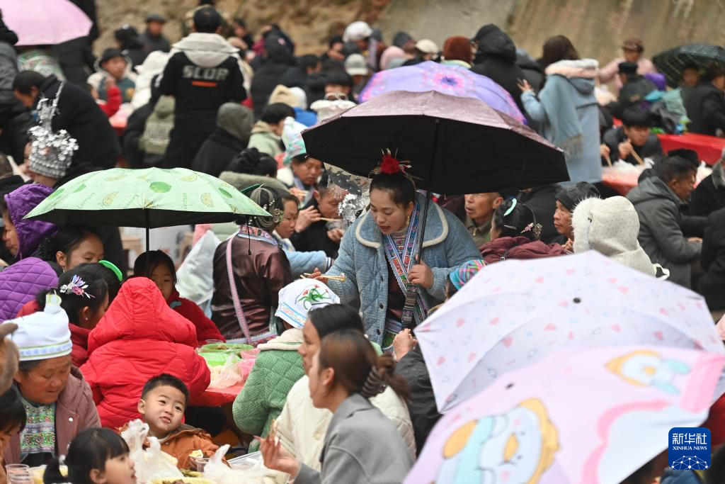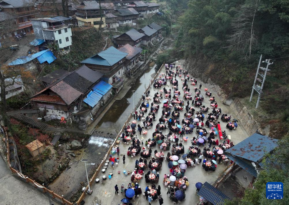 1月20日是大寒节气,广西柳州市融水苗族自治县杆洞乡党鸠村举办传统苗年庆祝活动,当地群众和游客在寒风细雨中吹芦笙、唱苗歌、跳苗舞、品百家宴,共度佳节。
