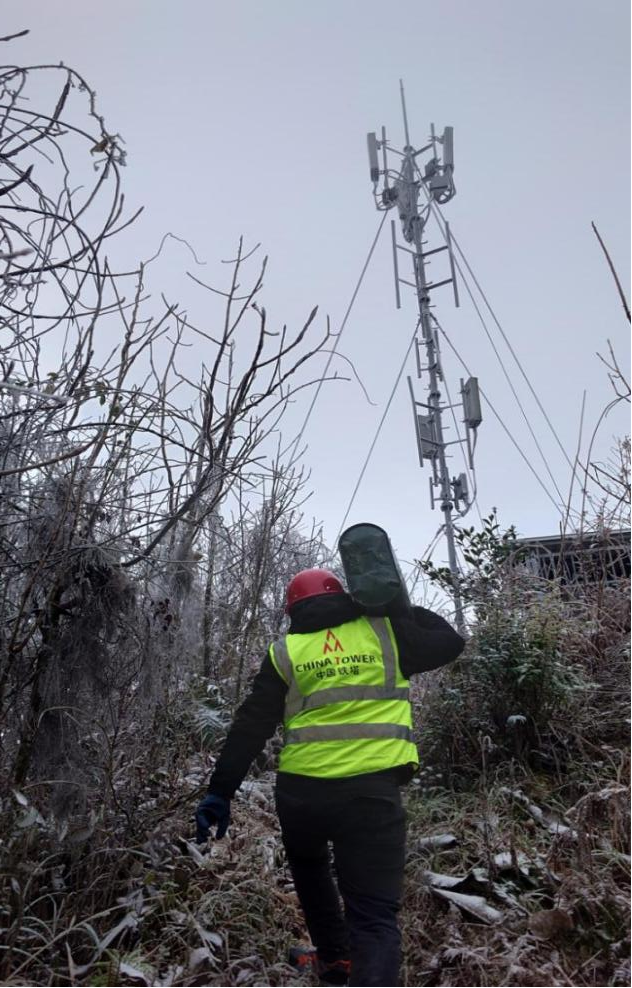 闻雪而动踏冰前行。桂林市全州县、龙胜县、资源县等山区出现道路结冰及设施覆冰情况,桂林铁塔迅速行动,克服道路积雪结冰、行车受阻等重重困难,第一时间对易遭受雨雪冰冻灾害点位的光缆、机房、基站等通信设施进行供电、积雪、冰冻物等情况的全面巡检,及时赶赴受损站点,全力做好通信保障工作。柳州融水苗族自治县同练乡大蒙基站无线机房突遇停电险情,因严寒导致高压线路覆冰下垂,触碰周边树木造成短路。面对冰雪封路、坡陡路滑的极端环境,柳州铁塔的抢修队伍迎风踏雪而行,在冰凌遍布的山路间争分夺秒地清理树障、修复线路,经紧张有序的作业,线路隐患被彻底清除,基站供电平稳恢复。