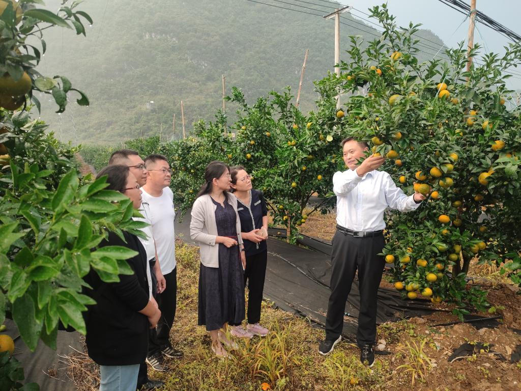 国家科技特派团柑橘产业专家在靖西市新靖镇壁零村柑橘示范基地指导果树病虫害防治技术。(廖美甜 摄)