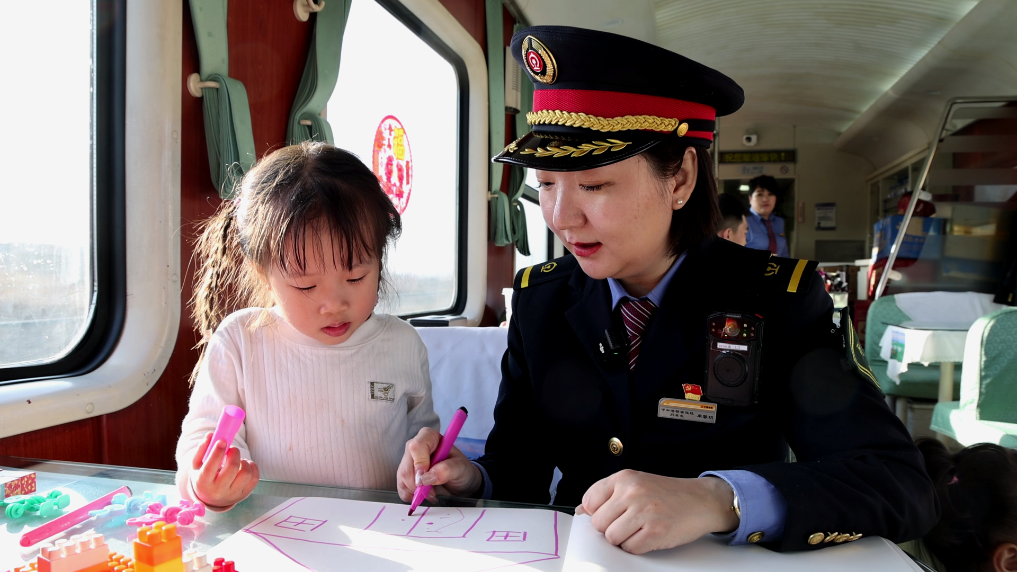 走进硬卧车厢,几名列车员正被孩子们围着。有的在辅导小学生写寒假作业,耐心讲解算术题;有的在用卡通图片,向学龄前儿童演示乘车安全知识。这个被称作“小候鸟移动教室”的小小空间,成了旅途中的临时学堂。一旁的乘务室里,备齐了彩色画笔、图画本、积木、拼图等物品,供孩子们免费取用。