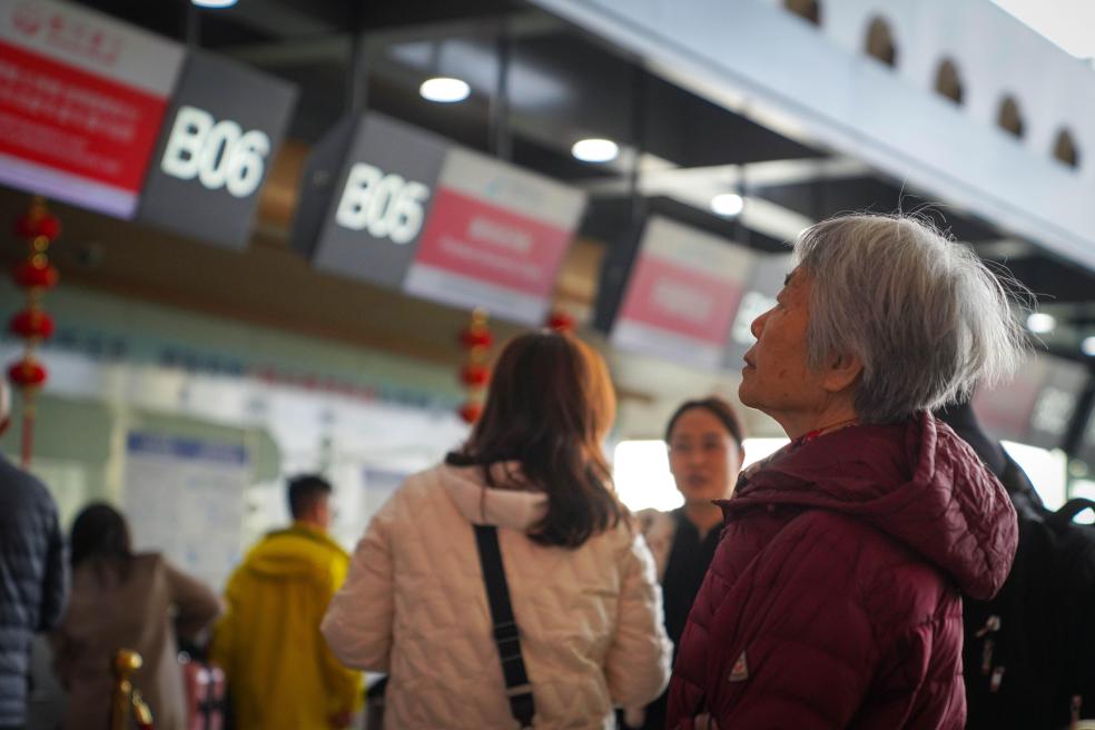 2月14日,在河南兰考南站,来自河南开封杞县的旅客程先生(右二)带着爱人、老父亲准备乘坐G6685/G376次列车赶赴北京,与孩子团聚。春运期间,G6685/G376次列车成为开封、兰考等地旅客去北京、郑州等城市“反向春运”的热门选择。郑州客运段高铁一队京郑班组加强对老年旅客的问询引导和精准帮扶,为“反向春运”之旅营造温馨的出行氛围。