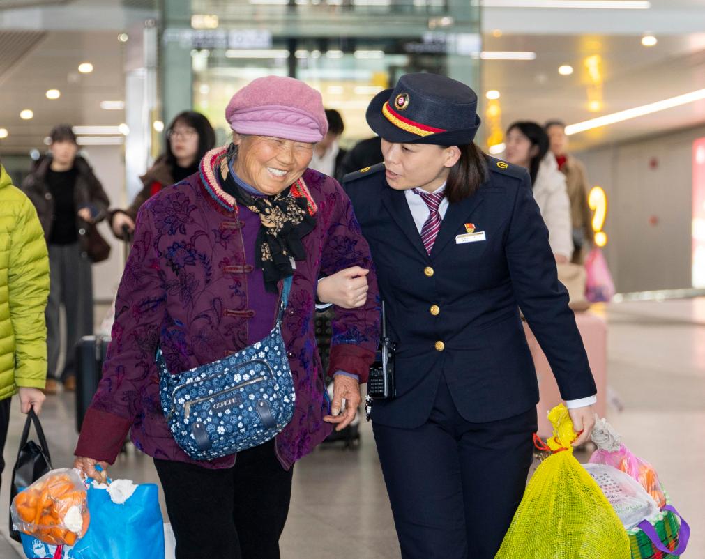 2月14日,在上海南站,72岁的曹阿姨(左)在客运员周佳帮助下出站。她从江西带来了家乡美食,准备去儿子家过年。