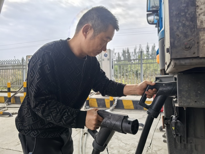 停稳车辆,黄启超跳下驾驶室,熟练地拔枪、插枪,充电桩瞬间完成识别,屏幕上随即弹出电量信息:32%。他端起保温杯喝几口,舒展一下筋骨,又从容回到驾驶室。“这辆车就像我的‘家’,大部分时间我都在这里度过。”黄启超说。