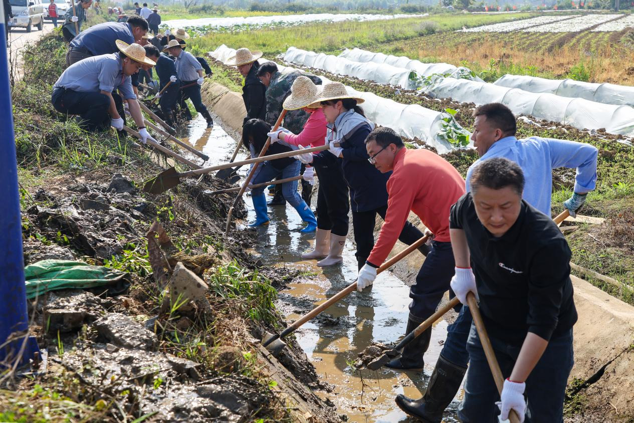 植树结束后,大家一同来到吴圩镇吴圩社区渌村坡灌溉渠开展兴修水利行动。干部、群众手持工具,下到田间灌排渠道认真铲除杂草,细致清除渠道内的枯枝、碎石等杂物,全面清淤疏浚,将原本淤塞的渠道变得畅通整洁。此次活动共清理灌溉渠道1000米,有效提升了渠道的蓄水、输水能力,为周边农田春耕灌溉提供了坚实保障,也为汛期排水防涝筑牢基础。