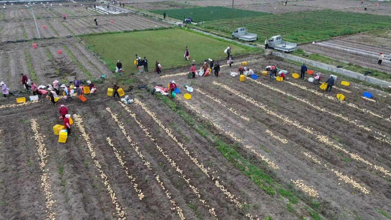 在民安镇丰村马铃薯种植基地的薯地里,翻薯机来回穿梭,一个个裹着湿润泥土的马铃薯翻滚而出。工人们紧跟在机器后方,分工协作、手脚麻利地捡拾、分装,搬运机随即跟进,将一袋袋、一箱箱封装好的马铃薯快速运至田边装车,忙而有序。