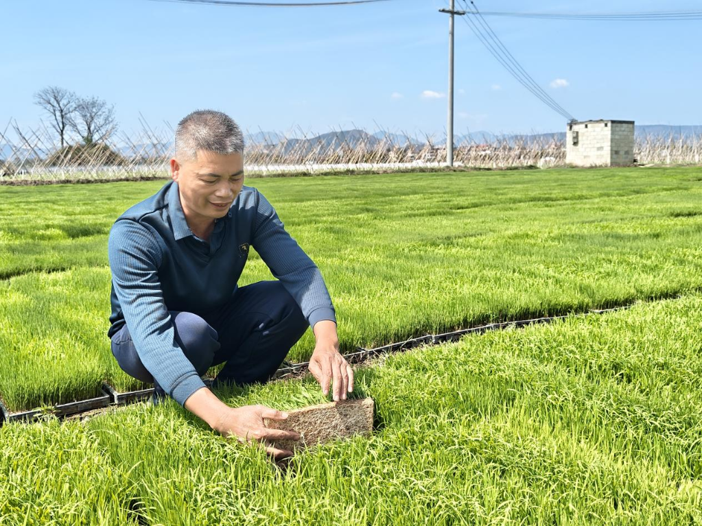 图为延寿国松农机服务专业合作社理事长陈国松在查看秧苗。