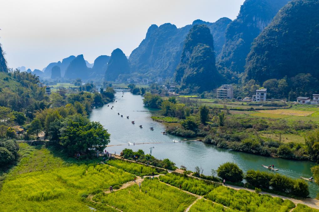 近日,广西桂林市阳朔县遇龙河景区,盛开的油菜花、蜿蜒的河流与苍翠的青山相映成景,游客乘坐竹筏在遇龙河上游玩,欣赏喀斯特山水之美。