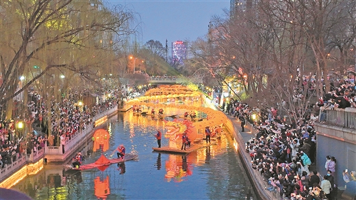 3月20日晚,阳朔“金龙”游于北京南长河上,市民纷纷驻足观赏。 广西云-广西日报记者苏时榕 通讯员唐国槟/摄
