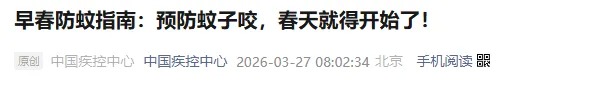 3月27日,中国疾控中心发文提醒:预防蚊子咬,春天就得开始了。